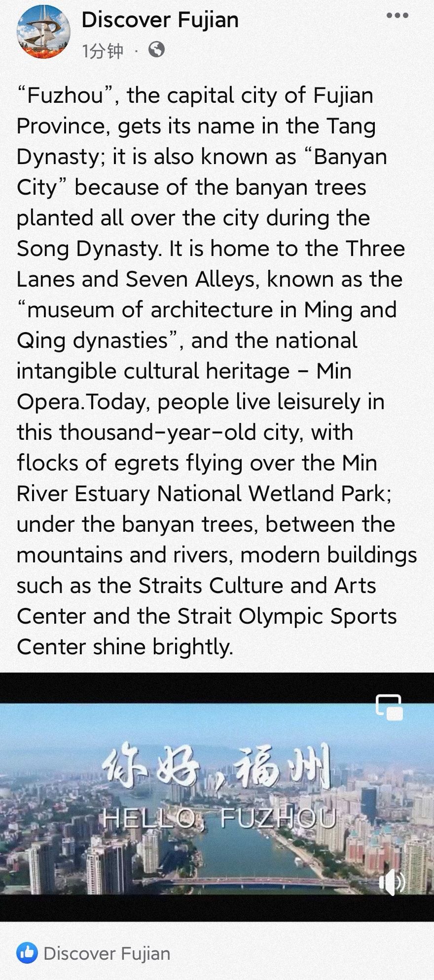 The promotion video, “Hello, Fuzhou”, is broadcast on the Facebook account “Discover Fujian”.