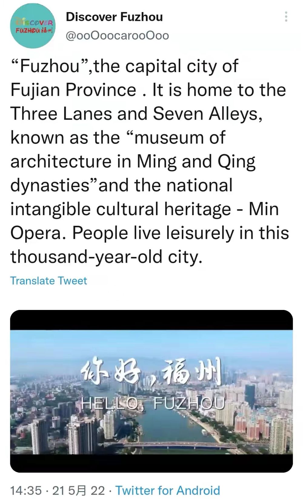 The promotion video, “Hello, Fuzhou”, is broadcast on the Twitter account “Discover Fuzhou”.