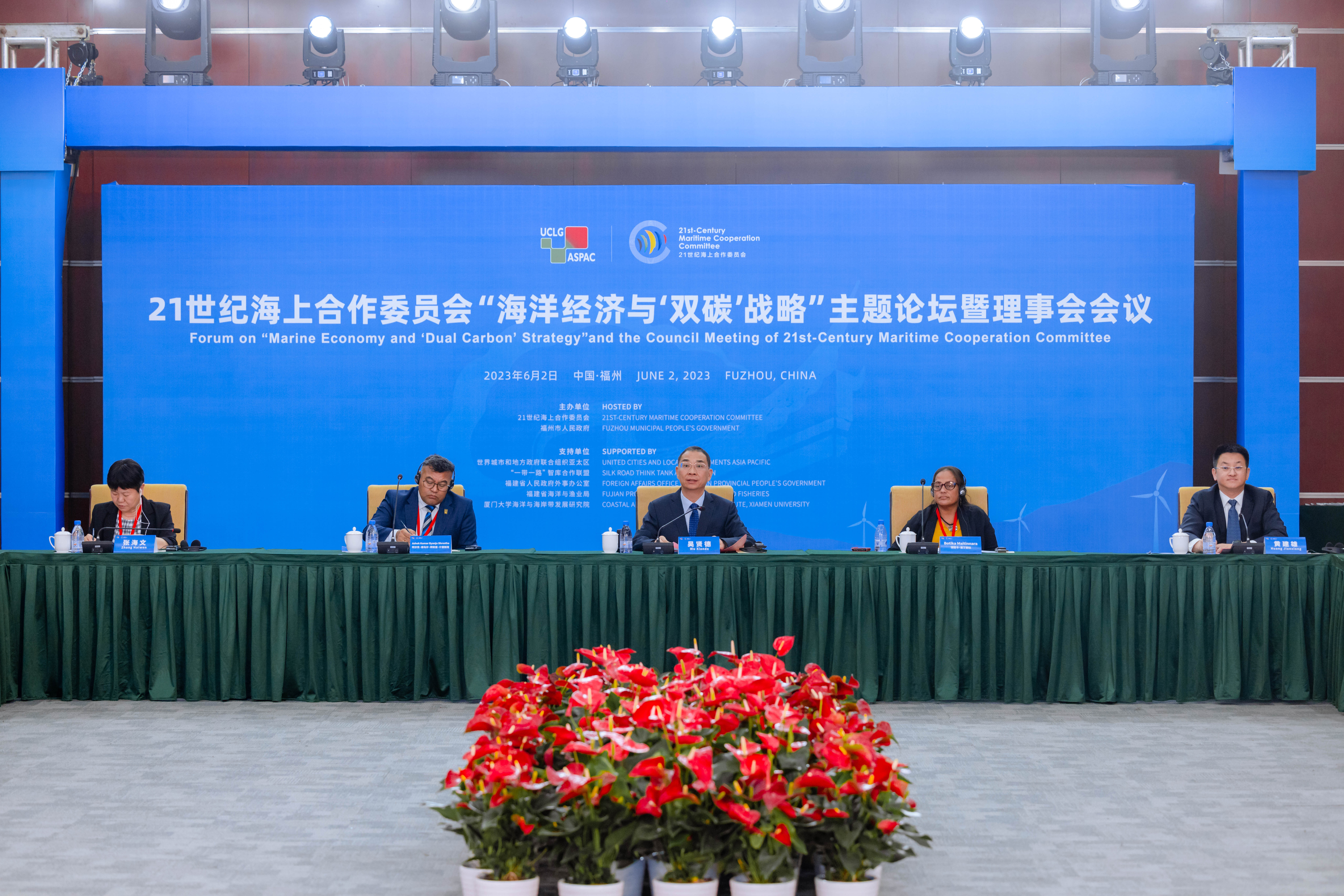 Forum on "Marine Economy and 'Dual Carbon' Strategy" and the Council Meeting of 21st-Century Maritime Cooperation Committee was held at Strait International Convention and Exhibition Center in Fuzhou on June 2, 2023. The event was held during the Fuzhou International Fisheries Expo in a combination of online and offline formats. The event was attended by officials and delegates including Ms. Chen Danhong, Director-General of Department of International Cooperation, Ministry of Natural Resources of the People’s Republic of China, Mr. Wu Xiande, Mayor of Fuzhou Municipal People’s Government and President of 21st-Century Maritime Cooperation Committee, Mr. Zhong Weiyun, Counsel Class 1, China Center for Contemporary World Studies, International Department of the CPC Central Committee, Dr. Zhang Haiwen, Director-General of Marine Development Strategy, Ministry of Natural Resources of the People’s Republic of China, Dr. Hong Huasheng, Former Vice President of the Standing Committee of Fujian Provincial People's Congress, Chief Scientist of the Coastal and Ocean Management Institute, Xiamen University, Mr. Cui Xiaojian, Deputy Director-General of National Marine Data Information Center, Ms. Gao Lin, Deputy Director-General of Marine Disaster Reduction Center, Ministry of Natural Resources of the People’s Republic of China, Zong Linhong, Deputy Director-General of Department of European and Asian Affairs, CPAFFC, Ms. Jona Widhagdo Putri, Deputy Secretary of China-Indonesia High-level Dialogue Cooperation Mechanism (video message), Mr. Ashok Kumar Byanju Shrestha, President of UCLG ASPAC, Mayor of Dhulikhel Municipality, Nepal, Mr. Shahbaz Khan, Director of UNESCO Beijing Office (video message), Mr. Ahmed Zaki Iskandar, Vice President of PEMSEA Network of Local Governments, Tangerang Regent, Indonesia, Ms. Botika Maitinnara, Chairperson of Kiribati Local Government Association, Kiribati.