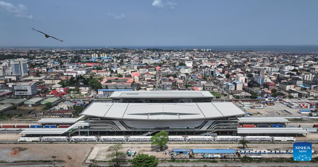 An aerial drone photo taken on March 2, 2024 shows a view of the Mobolaji Johnson Railway Station of the Lagos-Ibadan Railway in Lagos, Nigeria. (Xinhua/Han Xu)
