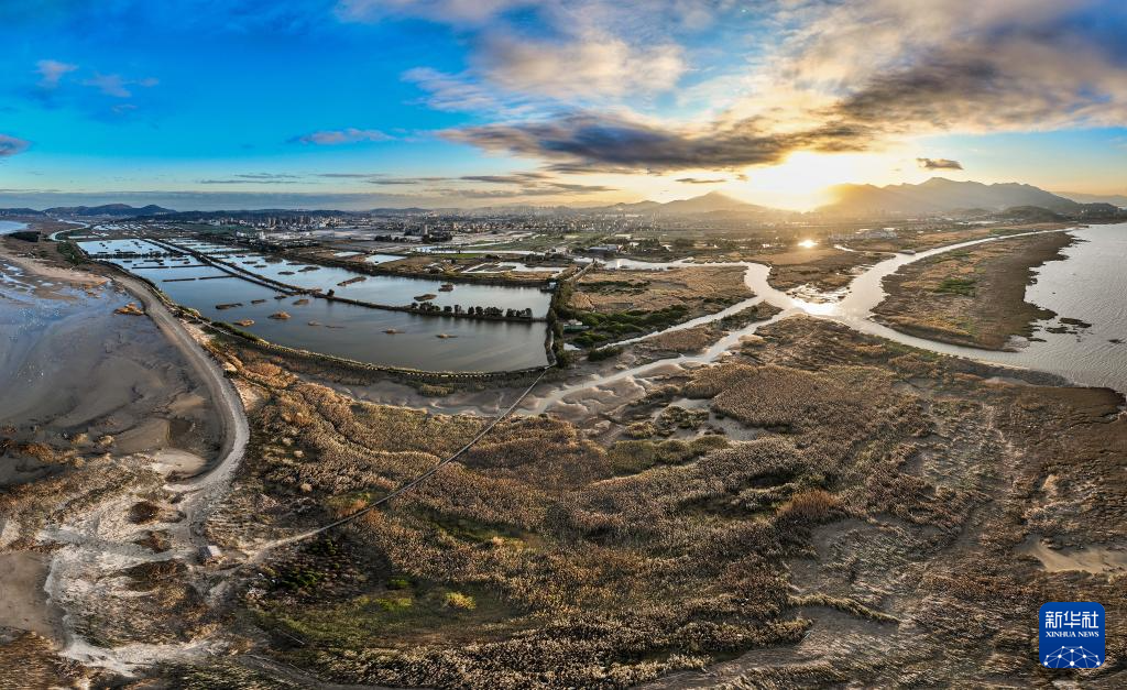 A panoramic aerial drone photo shows a view of the Minjiang River estuary nature reserve in southeast China's Fujian Province, Dec. 27, 2025.
