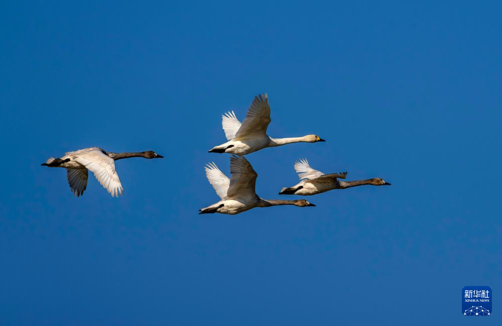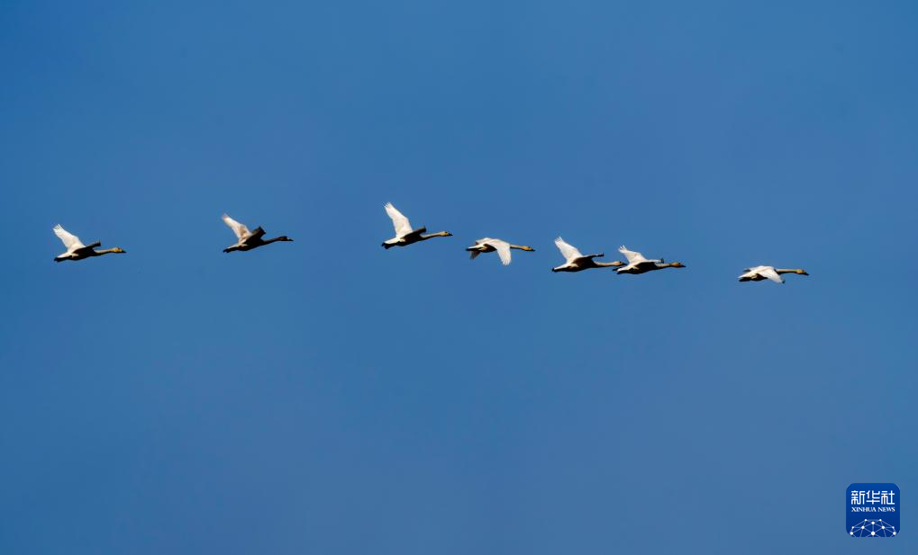Tundra swans fly over the Minjiang River estuary nature reserve in southeast China's Fujian Province, Dec. 27, 2025.