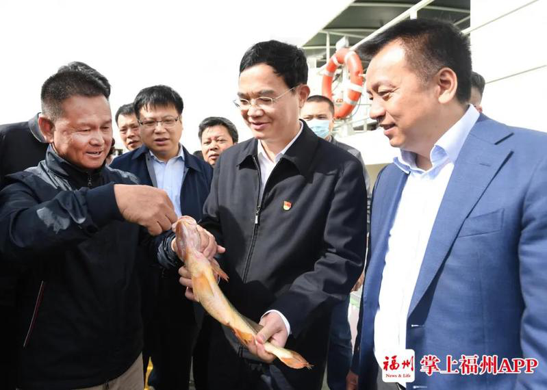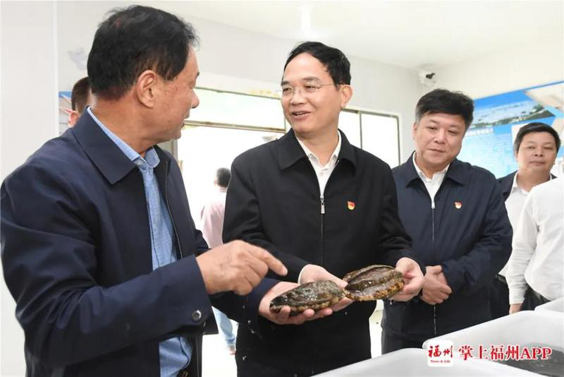 来到筱埕镇定海村,林宝金乘船出海登上“振渔一号”深远海养殖平台,询问平台性能特点、养殖和生产效益情况,与市、县部门和上海振华重工集团项目负责人现场会商,协调推动“百台万吨生态养殖平台”项目建设。在官坞村,林宝金走进“福鲍一号”种苗养殖基地,了解新品种鲍鱼培育及市场销售情况。他指出,水产养殖是连江的经济底盘,要坚持向科技、管理和规模要效益,积极培育新品种、开发新模式、推广新零售,在走好养殖“第一步”的同时,延伸精深加工、海洋旅游等产业链,推动一二三产融合发展。