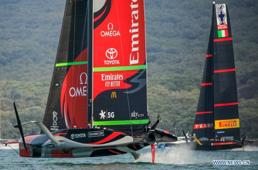 2020年12月19日,新西兰奥克兰举办的美洲杯世界联赛第三个比赛日,新西兰酋长队(左)和普拉达倍耐力红月号帆船队在比赛中(COR36/Studio Borlenghi/Handout via Xinhua)